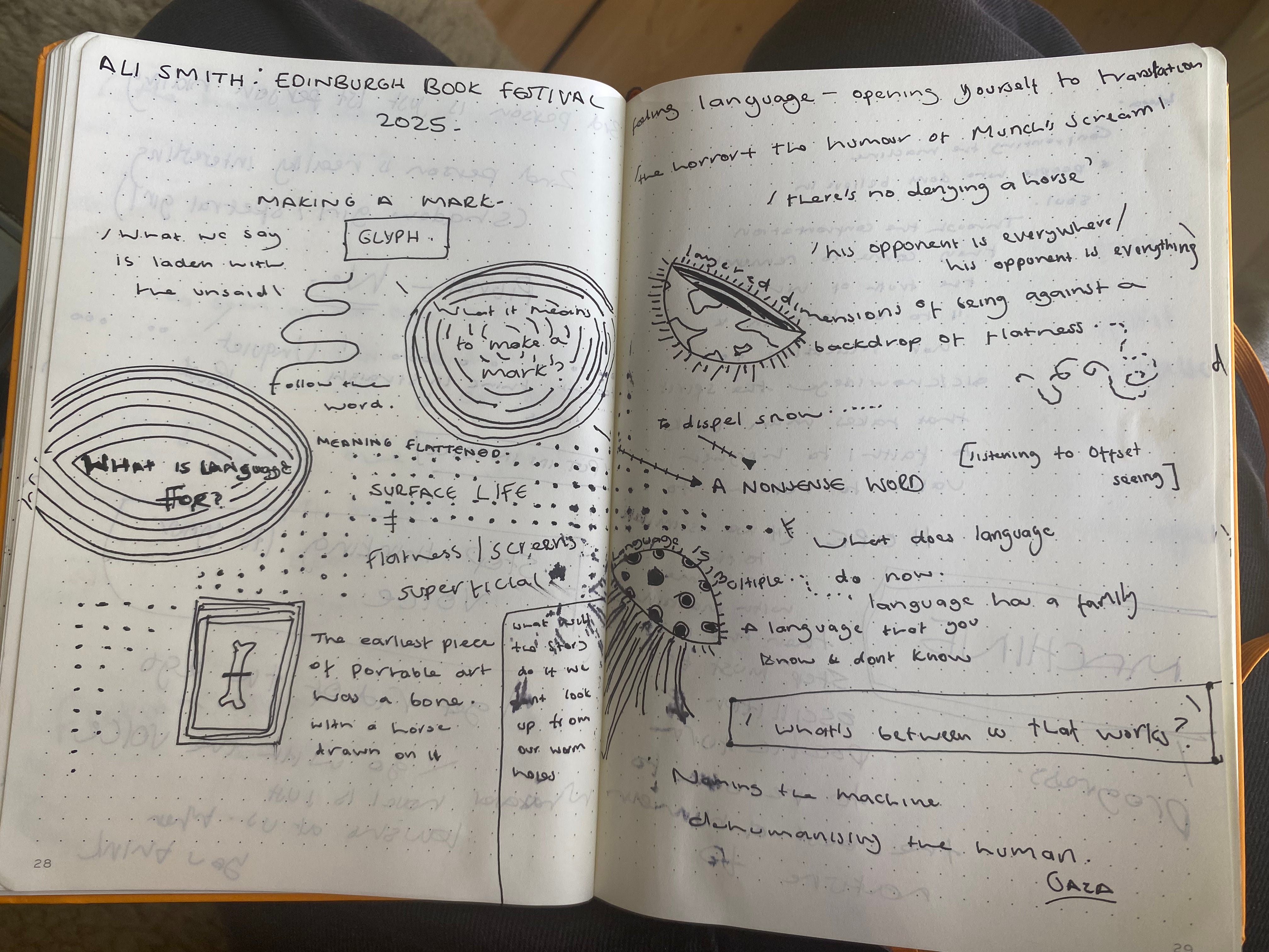 At this years Edinburgh International book festival Ali Smith spoke of language, of the flatness of the language of our times, of words being pulled from meaning and if I hadn’t been so ferverently making notes I wish I’d asked her about the words genocide, of death to the idf, of palestine action I wish I’d asked who gets to have the word holacaust, who gets to say that our taxes are directly supporting the death of children and who must take responsibility for it
