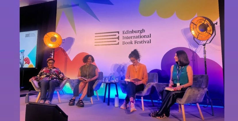 I bump into Sunny Singh in the green room. I’ve never met her before. She is dressed in the bright full colour of a warm sun, wearing her palestine scarf. we fall into conversation like friends, she talks with self awareness, speaks to her privilege, enacts care in her approach to storytelling, is loud on principle. In her session she begins by reading a statement calling out the white supermacist cultural institutions we sit in, speaking in solidarity with Fady Joudah the palestinian poet who pulled out of the festival after hearing of another event where a pro Israel speaker would be in attendance. she speaks without a hint of appeasing anyone in her voice, without want for validation.